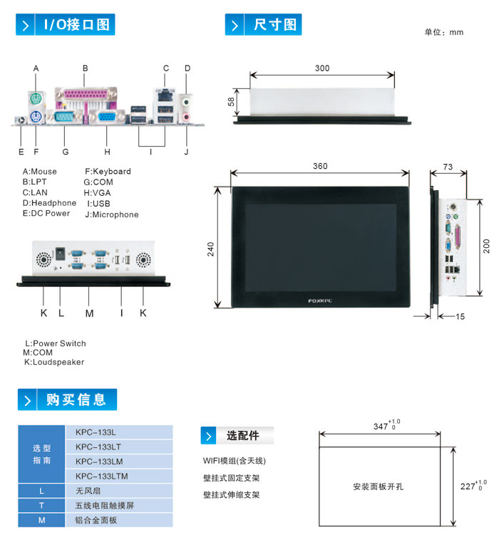 富士康工业平板电脑KPC-133LTM工业一体化工控机整机:KPC系列工业平板电脑采用赛扬1037U高性能主板,钣金和铝合金结构设计,黑色和银白色金属烤漆,由具有资质规模实验室经过一系列功能测试验证,性能稳定,质量可靠、节能环保,广泛应用与金融、网络、医疗、环保、交通、石油开采、电力、计量检测、监控、工业自动化。