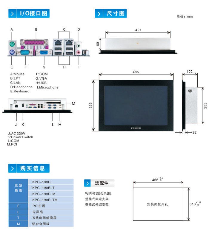 富士康工业平板电脑KPC-190ELTM:KPC系列工业平板电脑采用赛扬高性能主板,铝合金结构设计,黑色和银白色金属烤漆,由具有资质规模实验室经过一系列功能测试验证,性能稳定,质量可靠、节能环保,广泛应用与金融、网络、医疗、环保、交通、石油开采、电力、计量检测、监控、工业自动化。